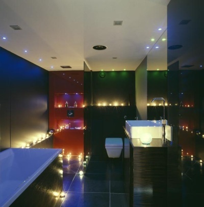 und somit den Küchenraum vergrößert. In der Küche wurde eine neue Möbelgarnitur mit einem hohen Bartisch eingerichtet. Die Oberfläche aller Möbel ist die gleiche. Die roten Wandschilder bilden einen Kontrast zu den Möbeln aus den tropischen Wenge-Holz (siehe Bild) und somit werden sie zur wahren Perle der Küche. Das Badezimmer wurde auch vergrößert - die Designer haben einen massiven Wasserbehälter entfernt und auf diese Weise den Platz für eine geräumige Duschkabine geschaffen, die mit einer Rauchglaswand getrennt wurde. Im Badezimmer wurde der Fernseher aufgestellt und die schwarzen, mit Glas dekorierten Wände wurden mit den Kaskaden aus Diodenleuchten geschmückt.