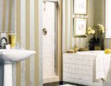 Das Badezimmer ist gewöhnlich klein und überladen, so aber machen die schmalen Streifen in fröhlichen Farben es geräumiger und stylischer. Die Streifen werden noch mehr betont, indem man verschiedene Farbtexturen wie matt und metalic verwendet